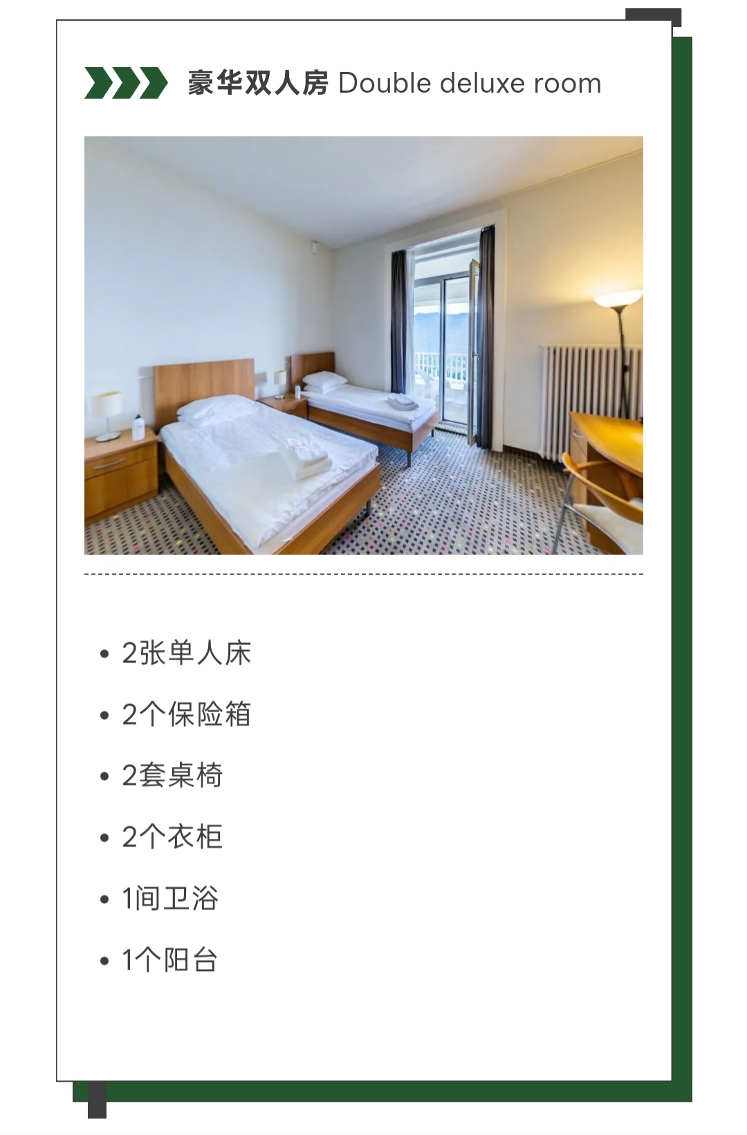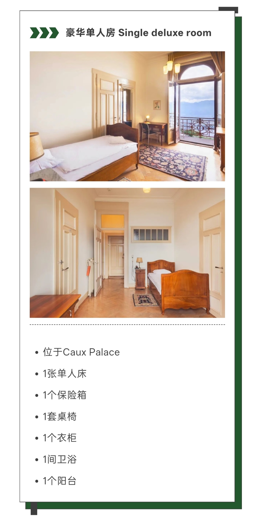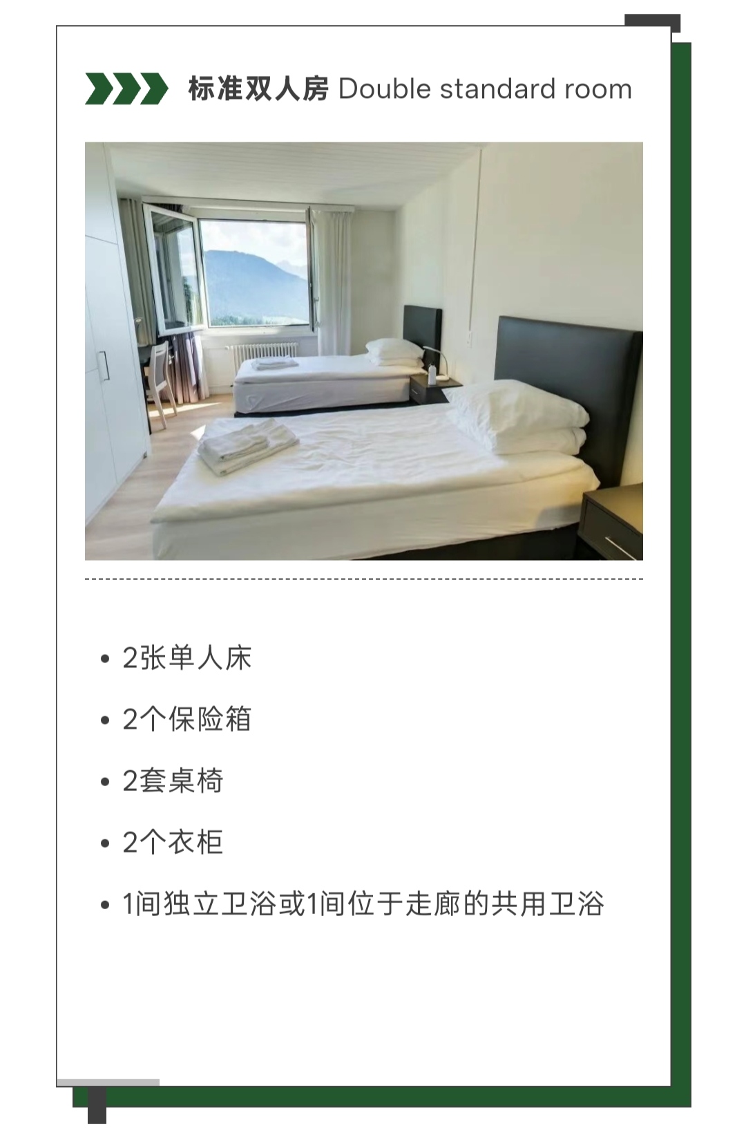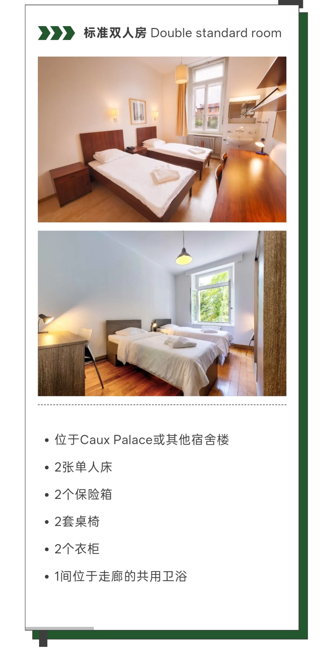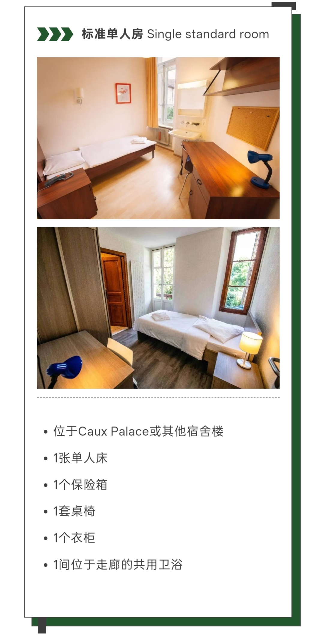校区为学生提供丰富的住宿选择,宿舍分布于主建筑Caux Palace及周边附属宿舍楼内,不同建筑的房型布局与窗外景致各具特色。其中,标准双人房费用已包含在学费内,无需额外支付;学生也可根据自身需求申请升级房型,房间分配遵循先到先得原则。